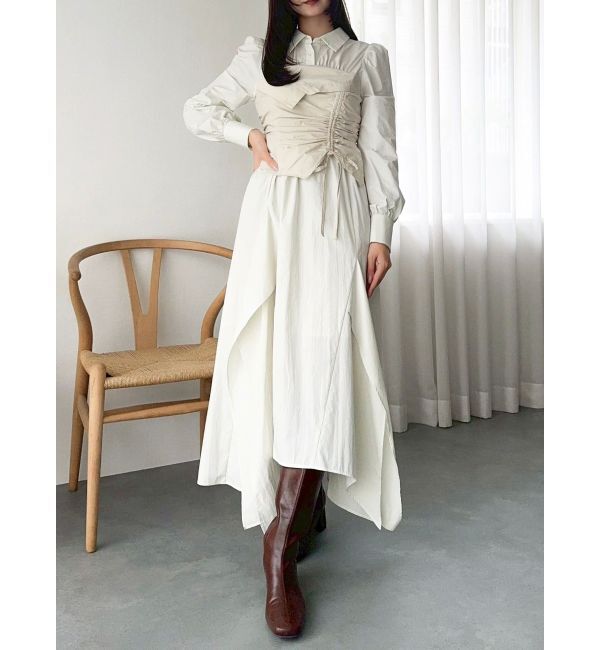 【商品】トップス部分はシャツ×ギャザービスチェ風デザインで、レイヤード風のこなれ感を演出。ビスチェ部分にはギャザーをたっぷりと施し、ギャザーでビスチ.. |