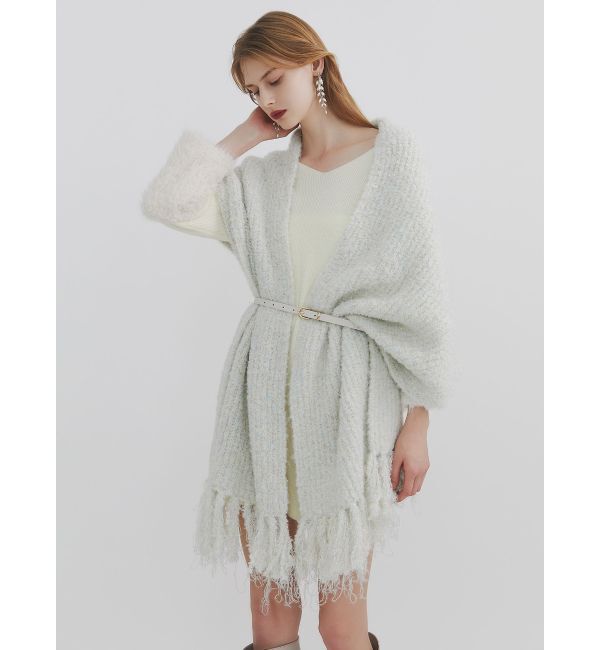 袖部分がシャギー素材になり、温かみと優し気な印象が相まって上品な印象に仕上げます。ウエストのベルトは取外し可能で、かっちり着用したい場合は付けてもOK.. |