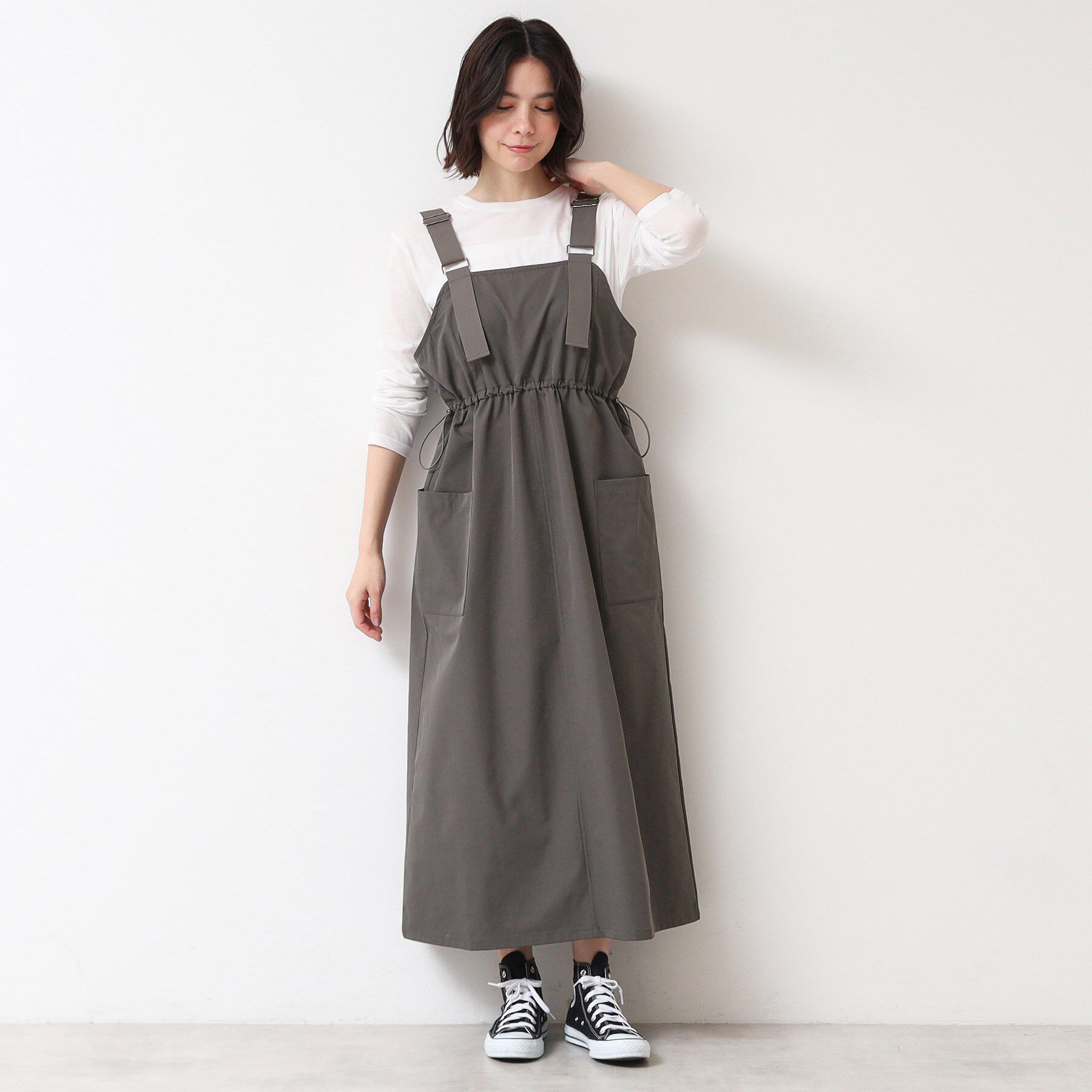 【デザインポイント】ウエストのドローコードや異素材のベルトやアウトポケットなどワークデティールがポイントのジャンスカです。光沢のある素材を使用してい.. |