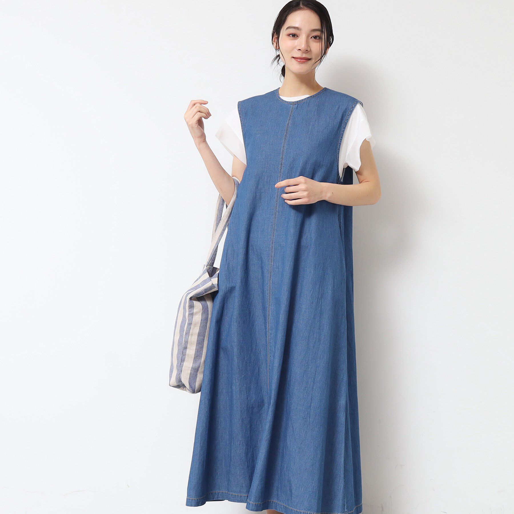 【デザインポイント】綿麻デニムのワンピース。昨年までのジャンバースカート仕様から丸首の1枚着に変更。軽くて清涼感のある素材使いなので夏まで着ていただ.. |
