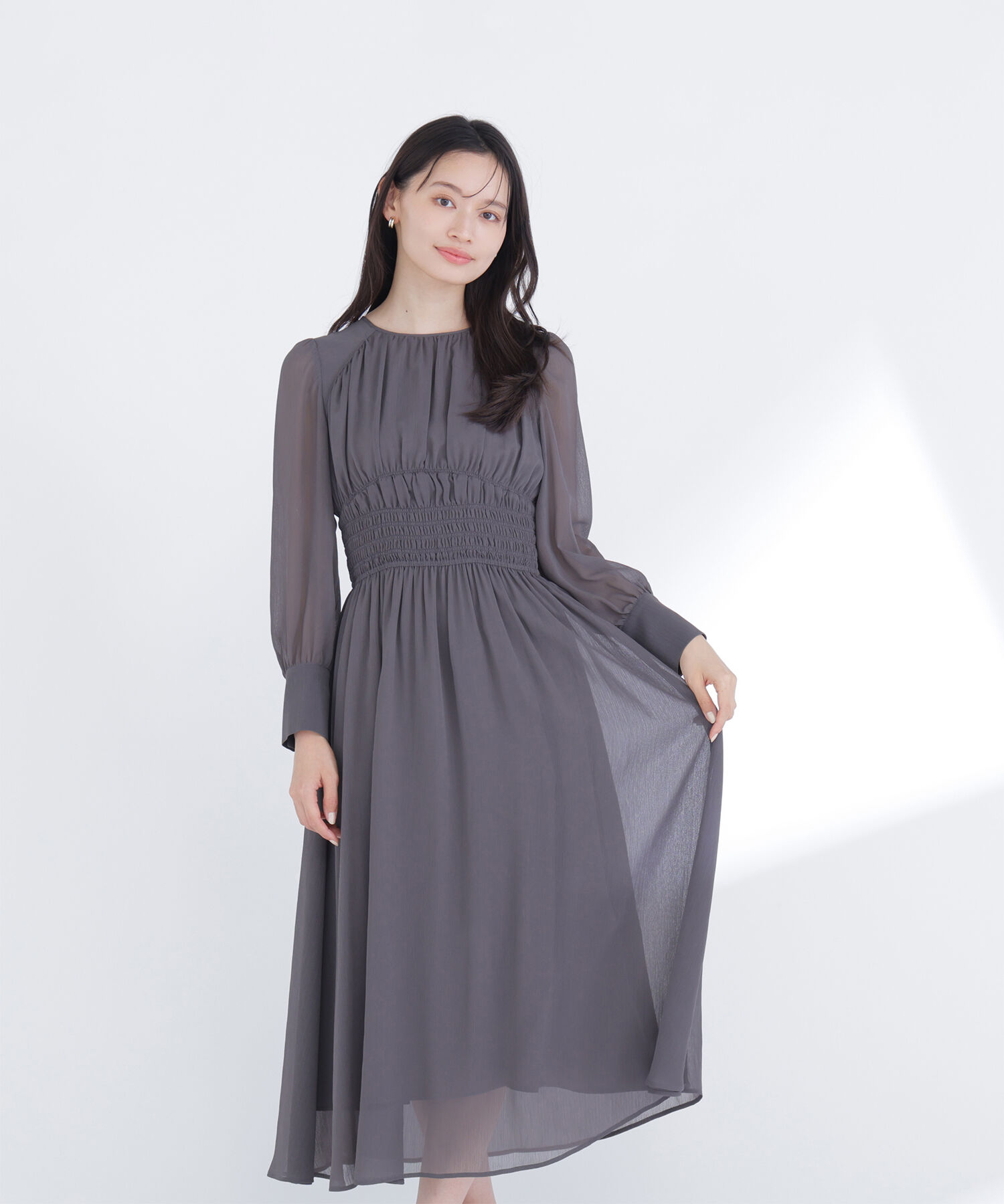 エレガンスな雰囲気が香るチュールドレス【2024 AW】ESTHE(エステ)軽く透け感のあるチュールで仕立てたセンシュアルなミディ丈ドレス。女性らしさが惹き立つ.. |