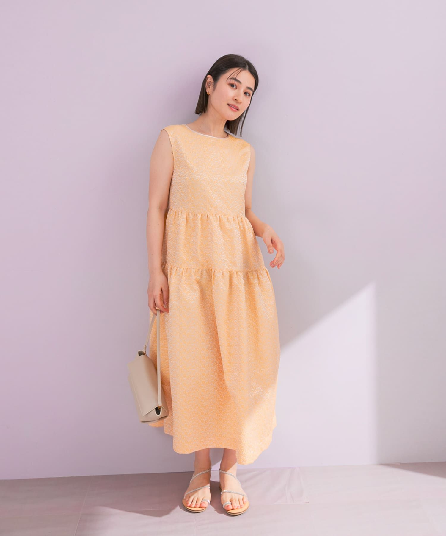 【一枚で華やかに決まる、ティアードワンピース】表情豊かな小花柄のジャガード素材をたっぷりと使用し、微配色の花柄が、大人の日常に品の良い華やかさを添え.. |