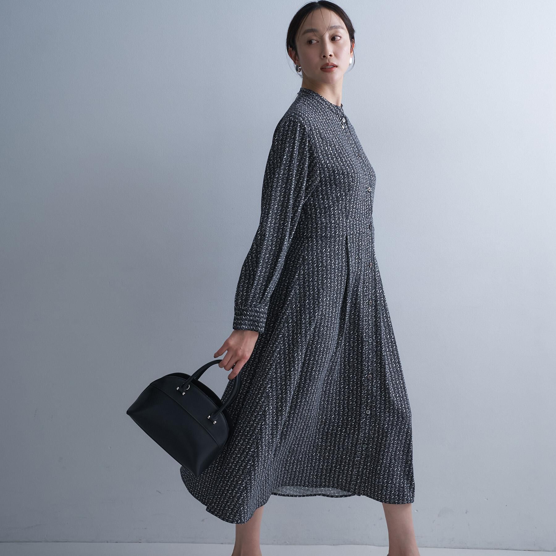 【デザイン】クラシカルなツイードをプリントデザインで表現した、大人の女性にぴったりのワンピース。後ろウエスト中心に施されたシャーリングゴム仕様で、フ.. |