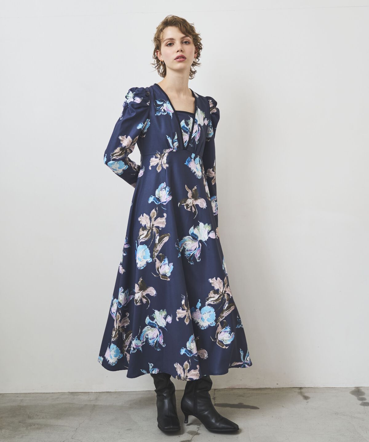 【水彩タッチの花柄が美しい大人のためのワンピース】【Design/Styling】手描きの水彩フラワープリントはオリジナルのデザイン。ふんわりとしたパワーショルダ.. |