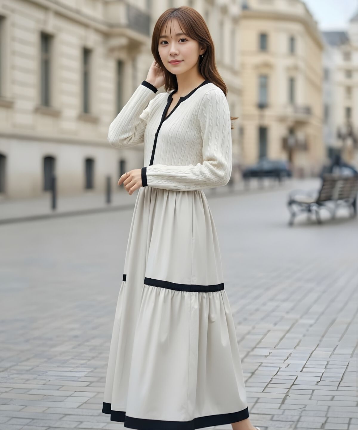 クラシカルな表情で魅せる、ケーブル編みドッキングワンピース【Design/Styling】・ケーブル編みニットトップスと、軽やかに揺れるスカートをドッキングしたワ.. |