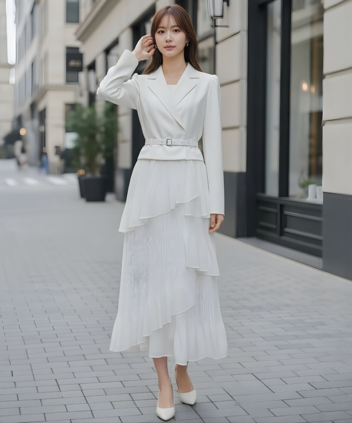 好印象を叶える、ジャケットレイヤードプリーツワンピース【Design/Styling】・シャープなジャケットデザインと軽やかなプリーツスカートをドッキングした、一.. |