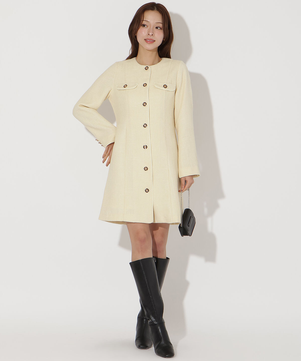 クラシカルな気品を纏う、ツイードミニワンピース【Design/Styling】・表情豊かなツイード生地を贅沢に使用した、きちんと感と女性らしさを兼ね備えたミニワン.. |