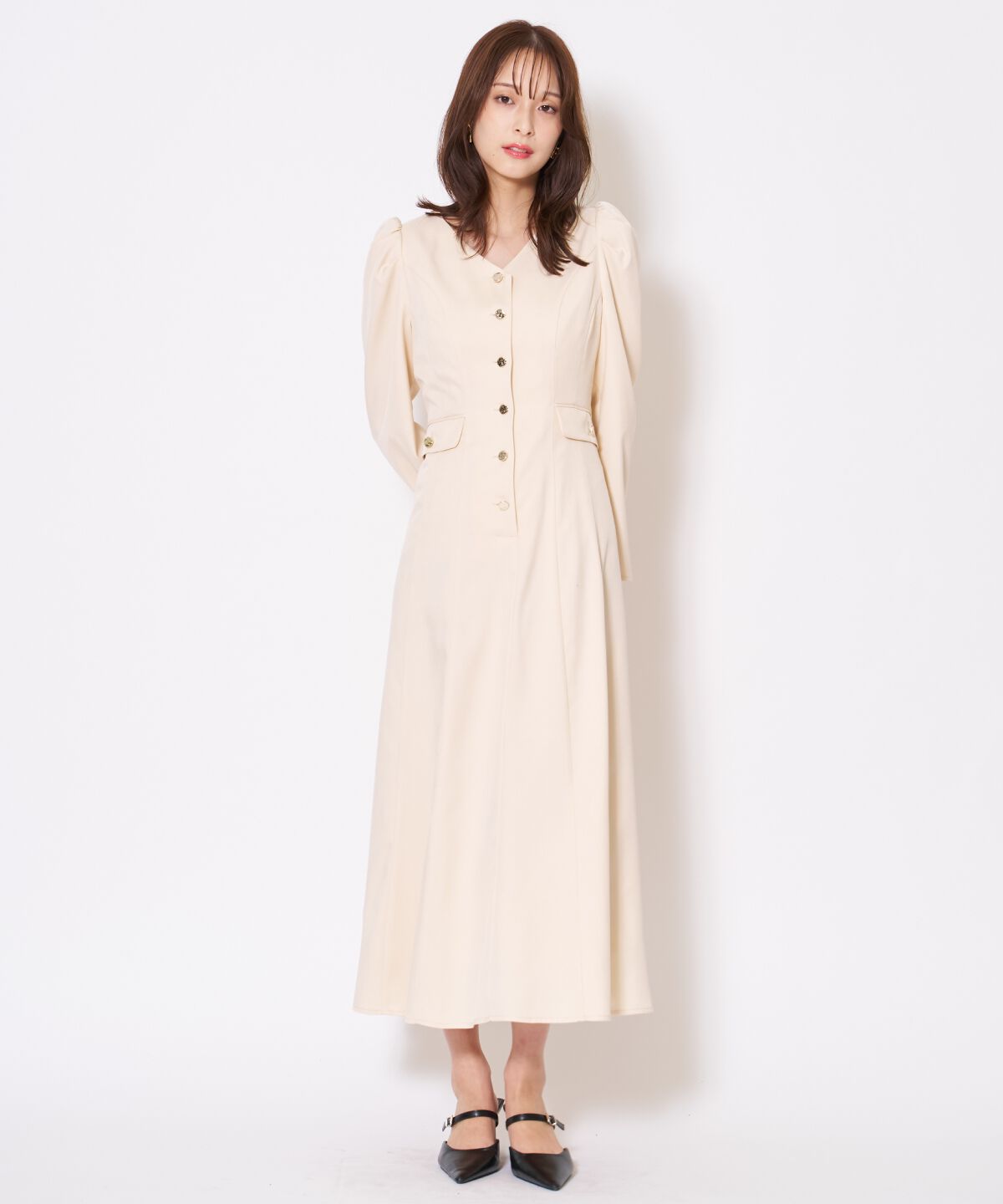 女性らしさを引き立てる、Vネックパフスリーブワンピース【Design/Styling】・デコルテをすっきりと美しく見せるVネックに、程よくボリュームを持たせたパフス.. |