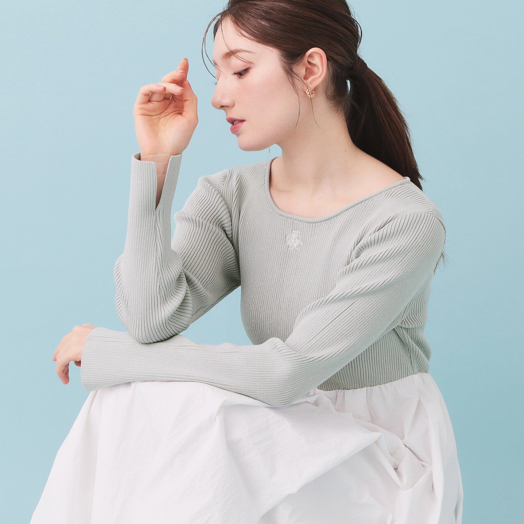 リブニットにエンブレム刺繍がポイントのドッキングバルーンロングフレアワンピース【デザイン】・ドッキングバルーンスタイルが特徴のロングフレアワンピース.. |