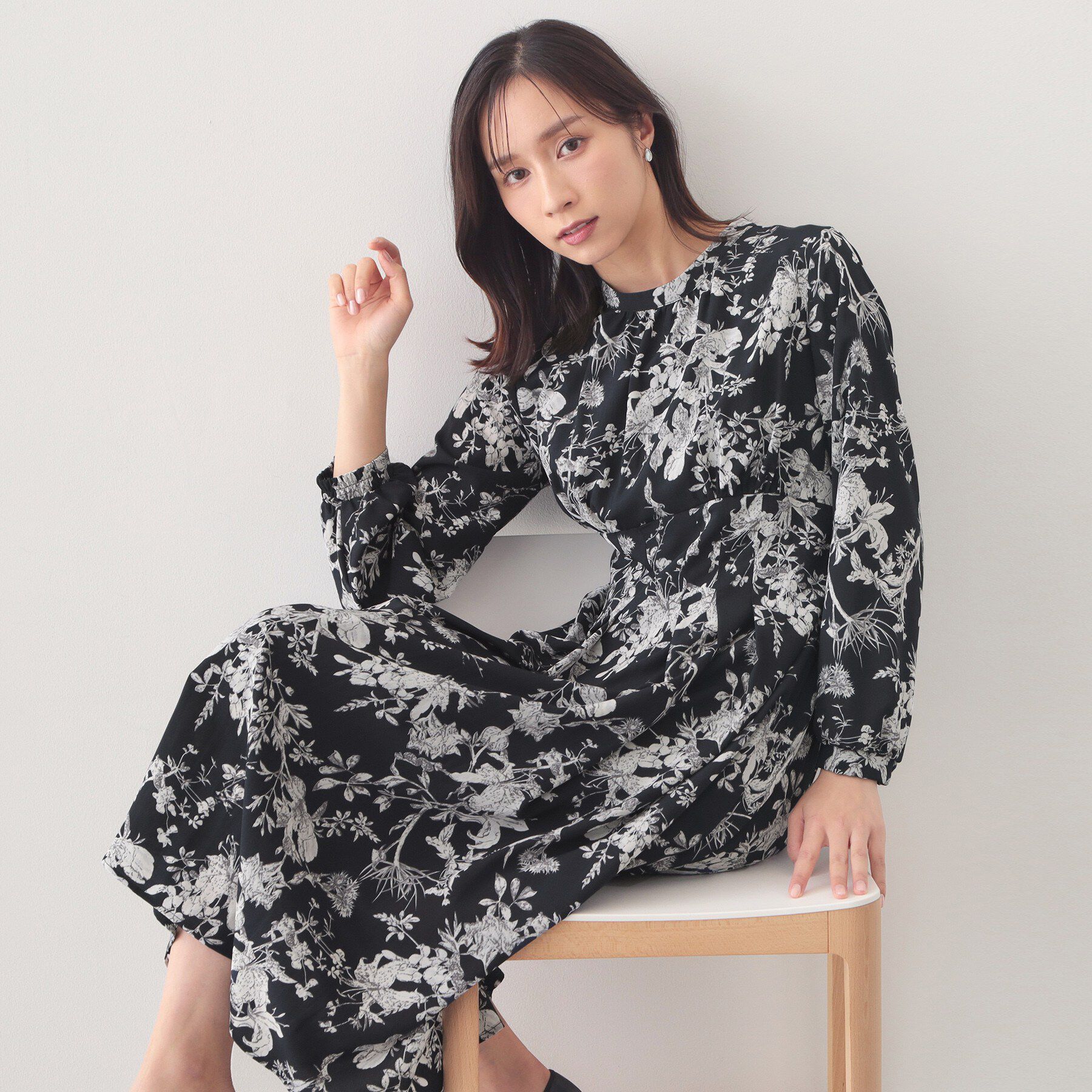 繊細なフラワープリントが印象的なハイネックタックワンピース【デザイン】・上品なフラワープリントが施され、華やかさとエレガンスを兼ね備えた一着。・ハイ.. |