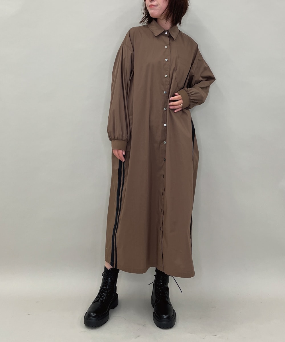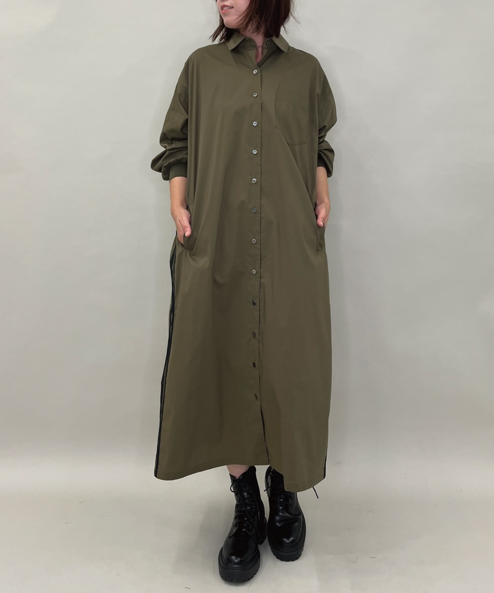 ・al'aise modulation・ 【デザイン】サイドの配色ラインがスポーティな印象のシャツワンピース。さらっと着用するだけで大人カジュアルなスタイリングが完成.. |