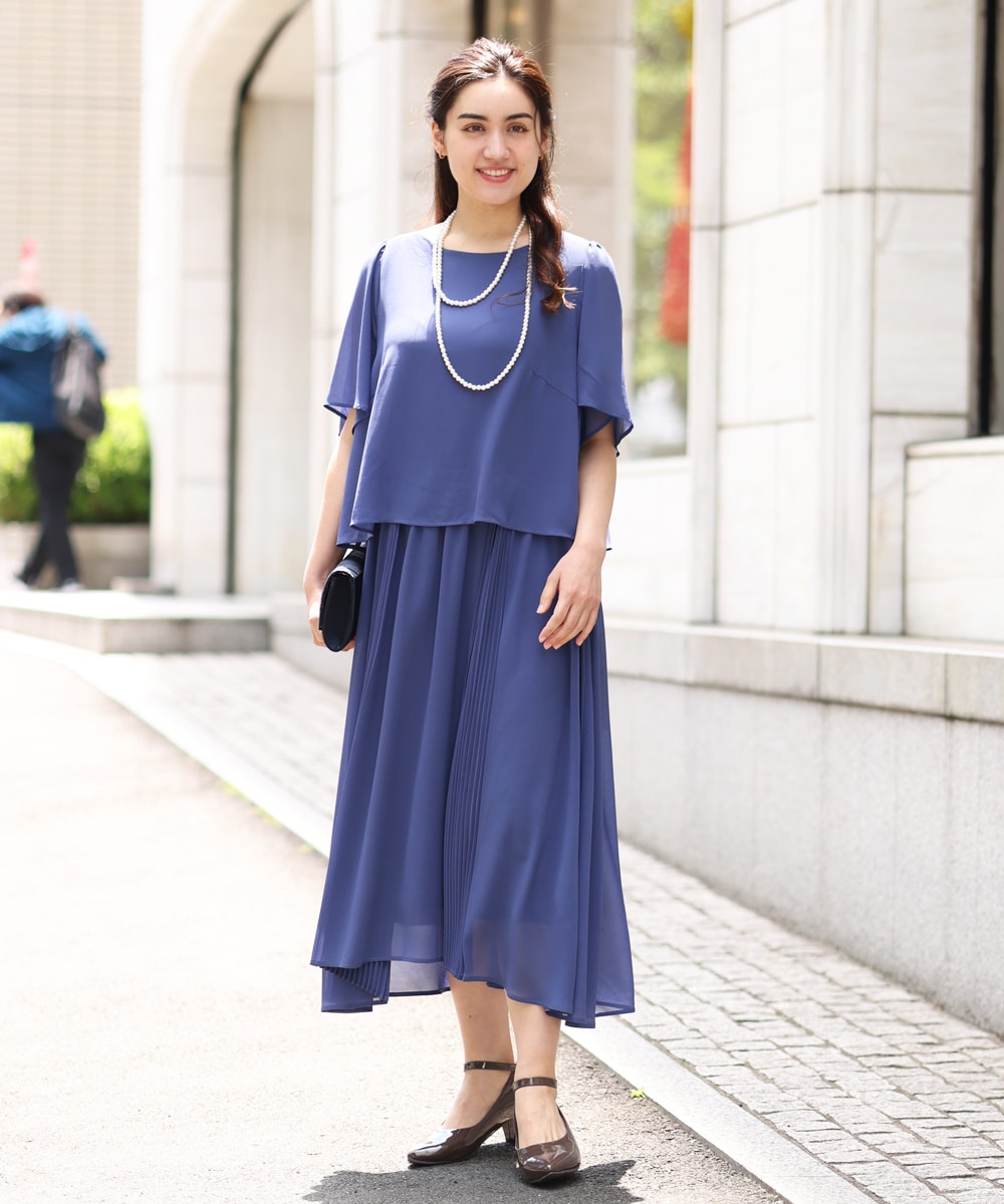 ◆柔らかに揺れるプリーツが華やかなシフォンワンピース◆ 【デザイン】 ブラウスとスカートを着ているように見えるセットアップ風デザインはさりげなく気になる.. |