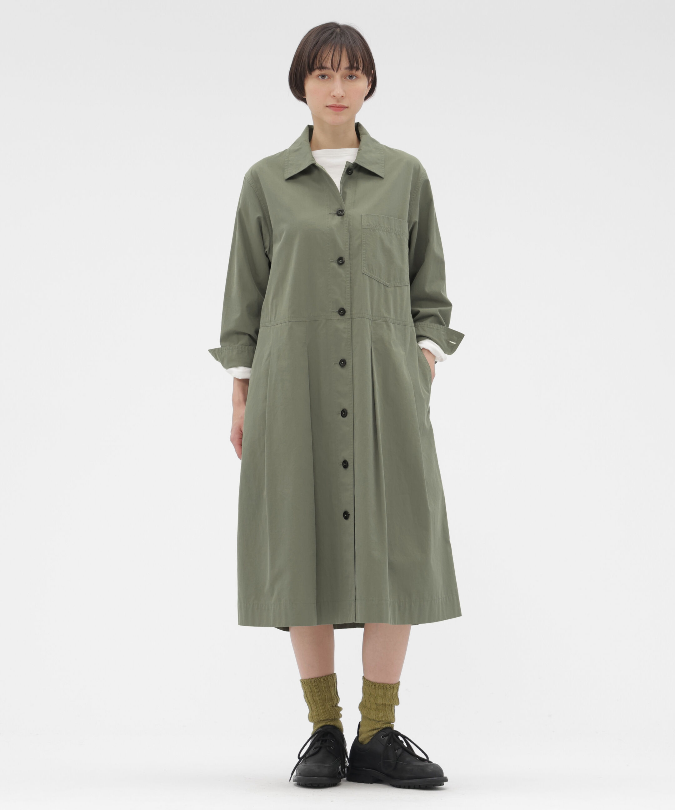ワークウェアに用いられるギャバジンをベースにした、コットンツイル素材のドレス。強めのワッシャー加工で揉み込み、反発樹脂を加えることで、シワを抑えなが.. |