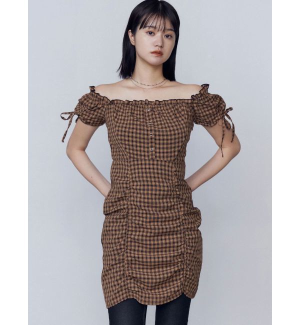 1枚で存在感のあるギャザーデザインたっぷりのミニワンピース■デザイン袖はオフショルにも出来る2WAYデザインで、袖口のリボンがアクセントになってくれます。.. |