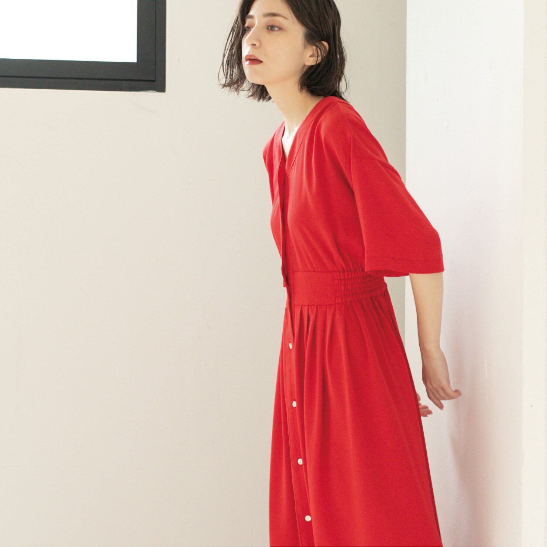 シャーリングゴムでフィット&フレアシルエットを演出したワンピース【デザイン】・フィット&フレアで華やかに着こなせるワンピース。・ゆるやかなVネックで.. |