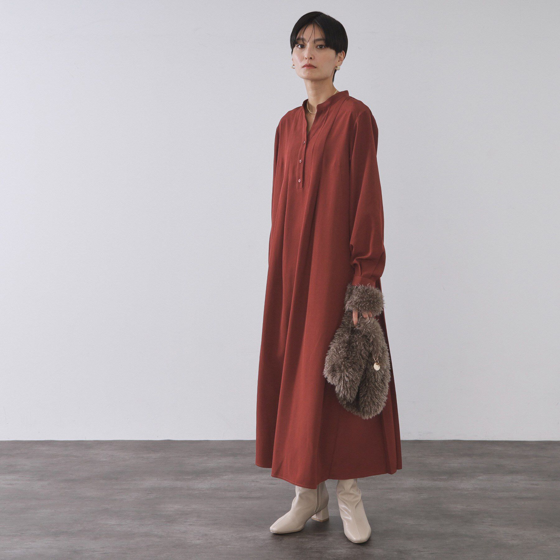 プリーツのバックスタイルがポイント!リラックス感のあるシルエットがこなれ感を演出するシャツワンピース【デザイン】・身体のラインを拾わないリラクシーな.. |