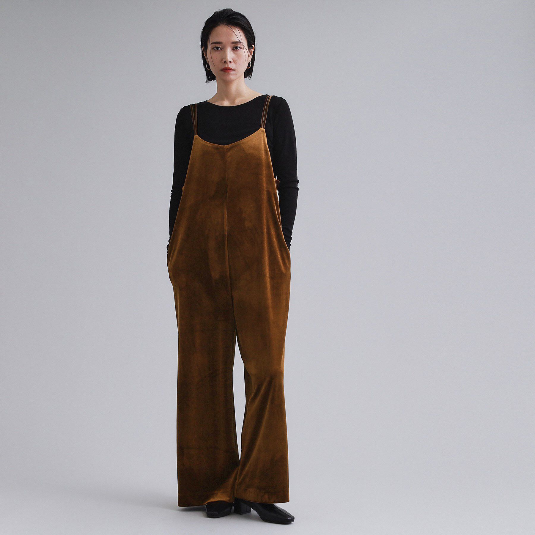 ダブルストラップデザインのベロアサロペット【デザイン】・ストレッチ性があり着心地の良いベロア素材のサロペット。・身頃は程良くゆとりを持たせながら、裾.. |