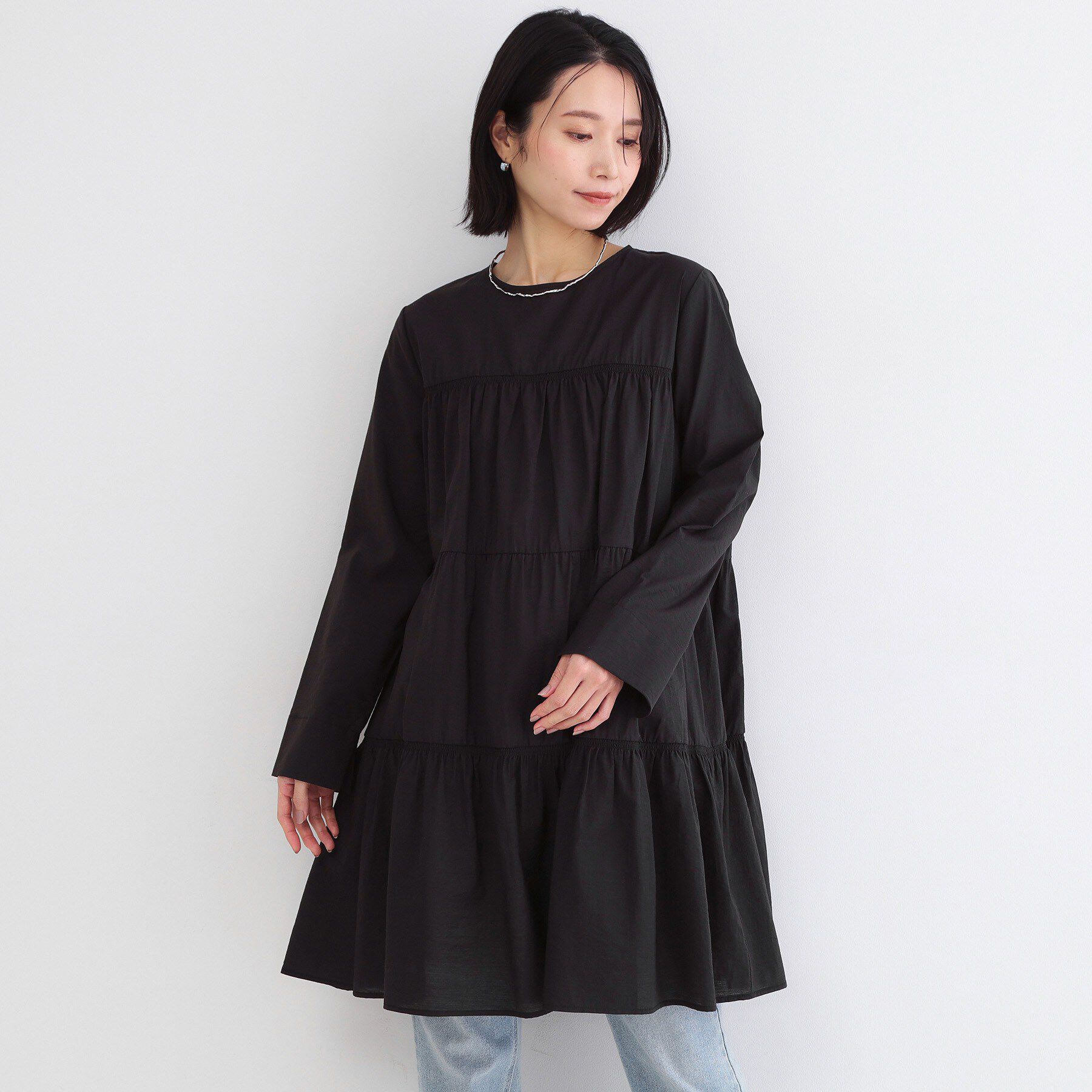 ブラウス感覚でパンツレイヤードにもおすすめのティアードワンピース【デザイン】・ティアードデザインのボリューム感が華やかなミニワンピース。・1段目と3段.. |
