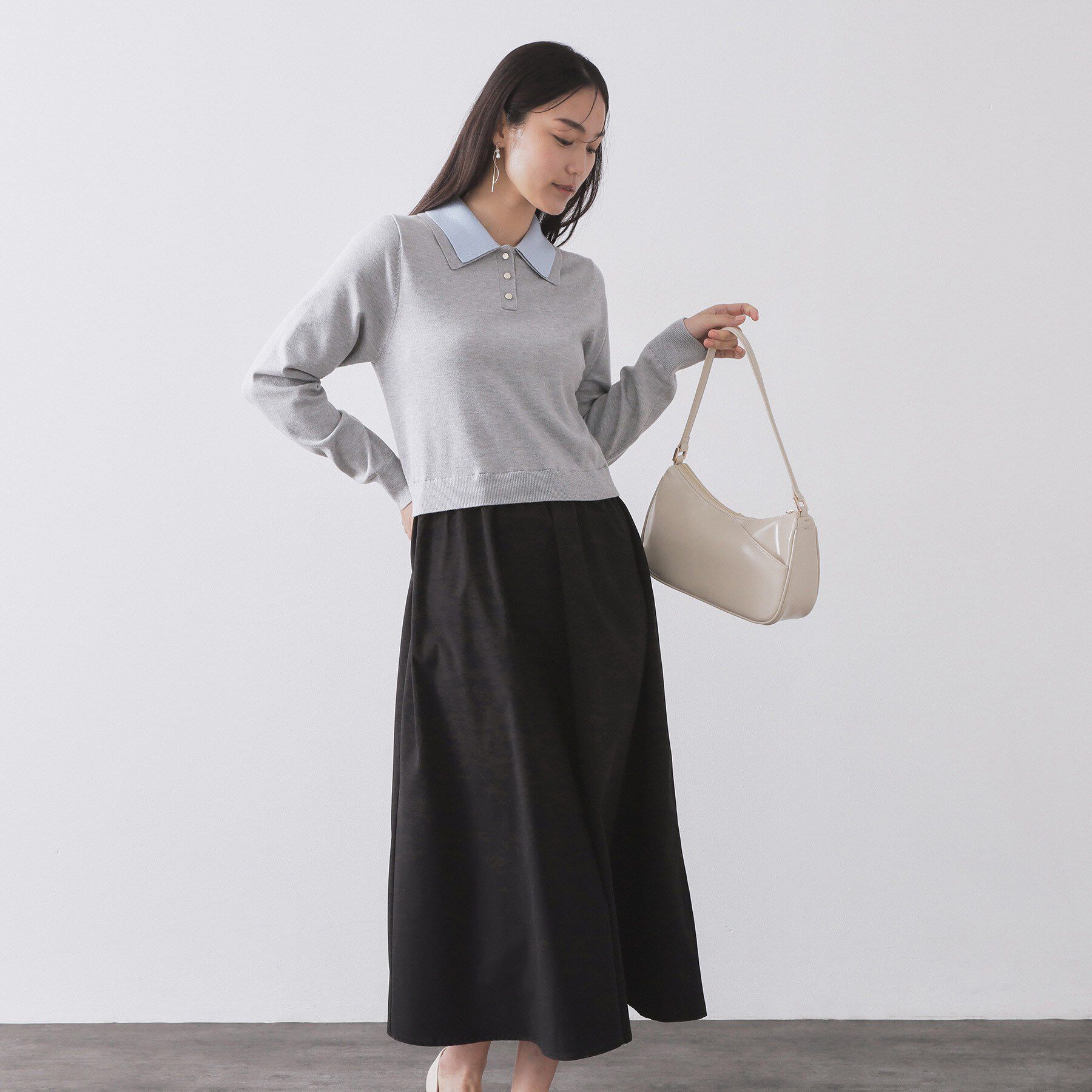 二重になったポロ衿がポイント!一枚で着映える、ニット×布帛のドッキングワンピース【デザイン】・上身頃がニット、スカート部分が布帛のドッキングワンピー.. |
