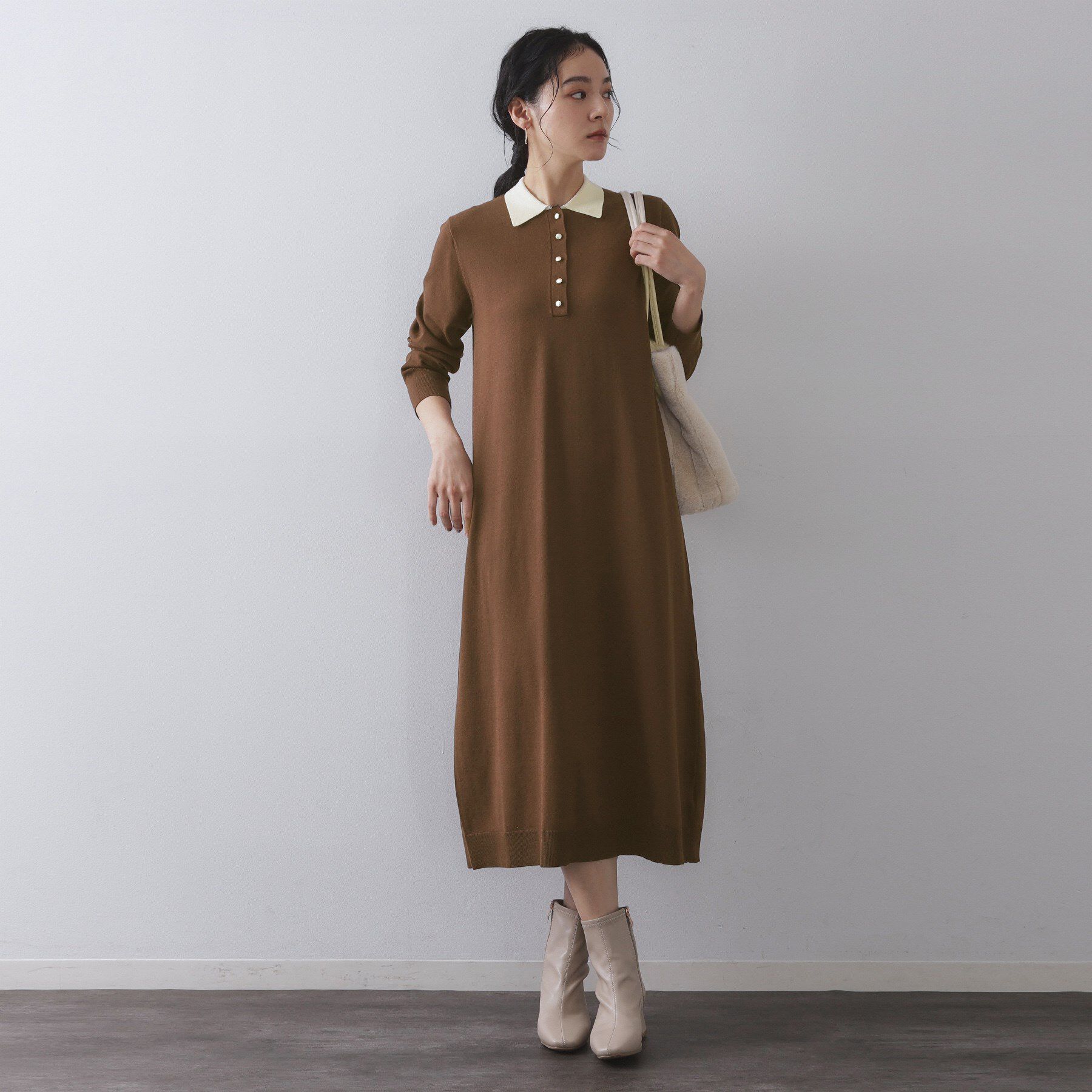 シンプルな中に上品さが光るポロ衿ニットワンピース【デザイン】・クラシックなポロ衿デザインがトレンド感もあり、カジュアルながらも魅力的なニットワンピー.. |
