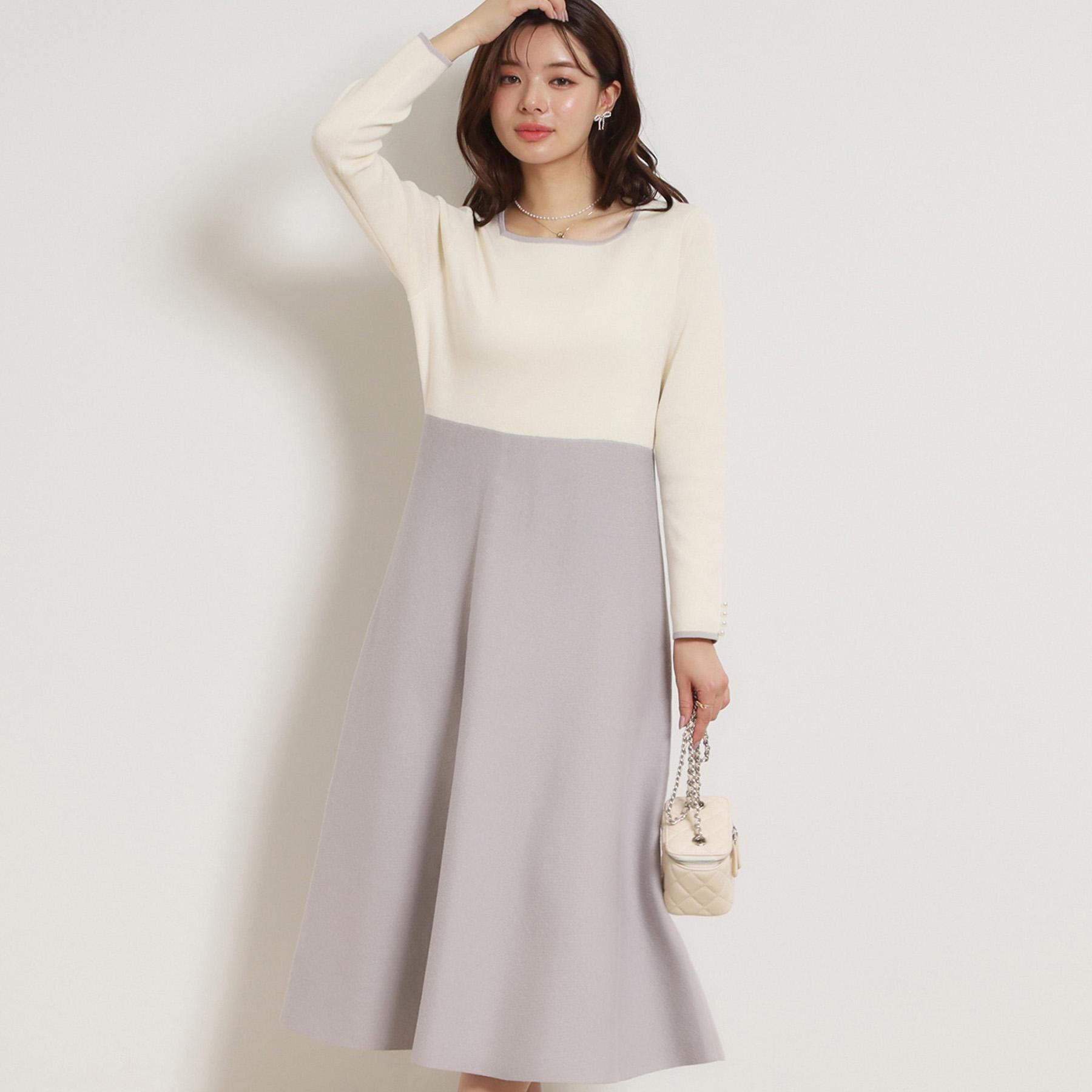 【クチュール ブローチ/Couture brooch】 【ハレの日・通勤】スクエアネック バイカラー ニットワンピース