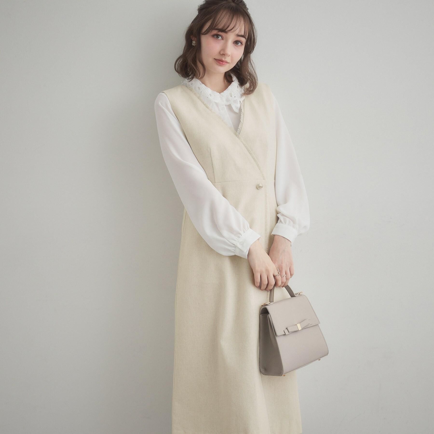 ラップ風デザインのジャンスカです〜POINT〜衿ぐりから前立て端にかけて共生地で作ったフリンジテープを挟み込んでいますAラインのすっきり見えシルエットにな.. |