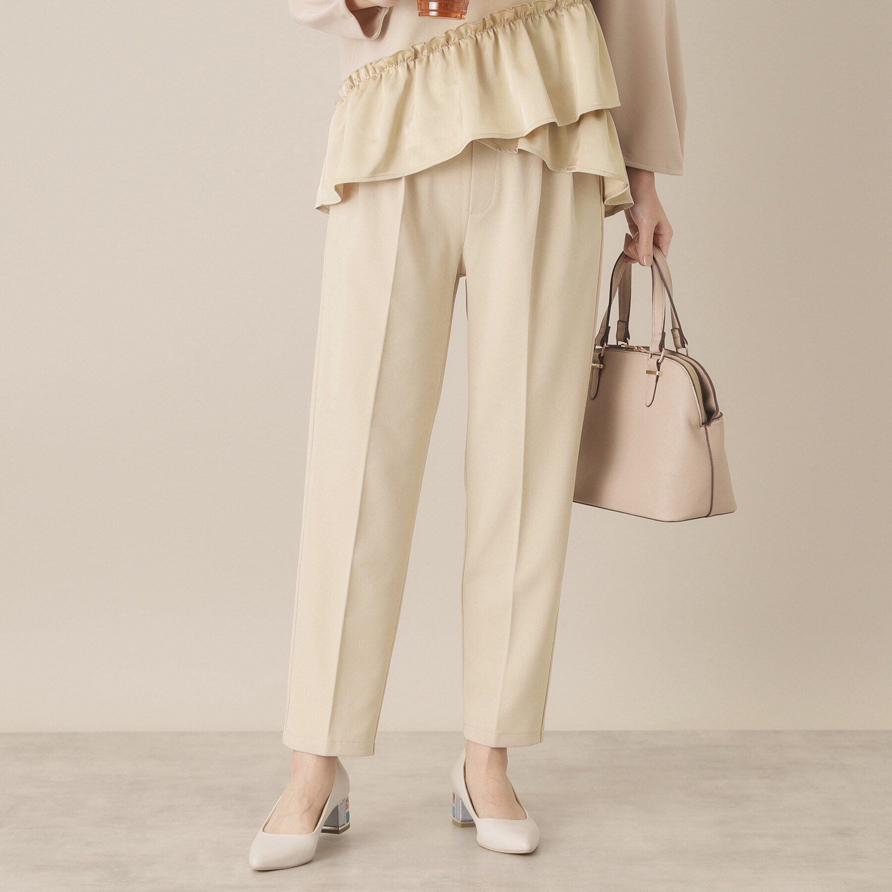 【デザイン】幅広いシーンで活躍するベーシックなテーパードパンツ。同素材のブラウス・ジャケットとセットアップで着用可能。程よいストレッチのポリエステル.. |