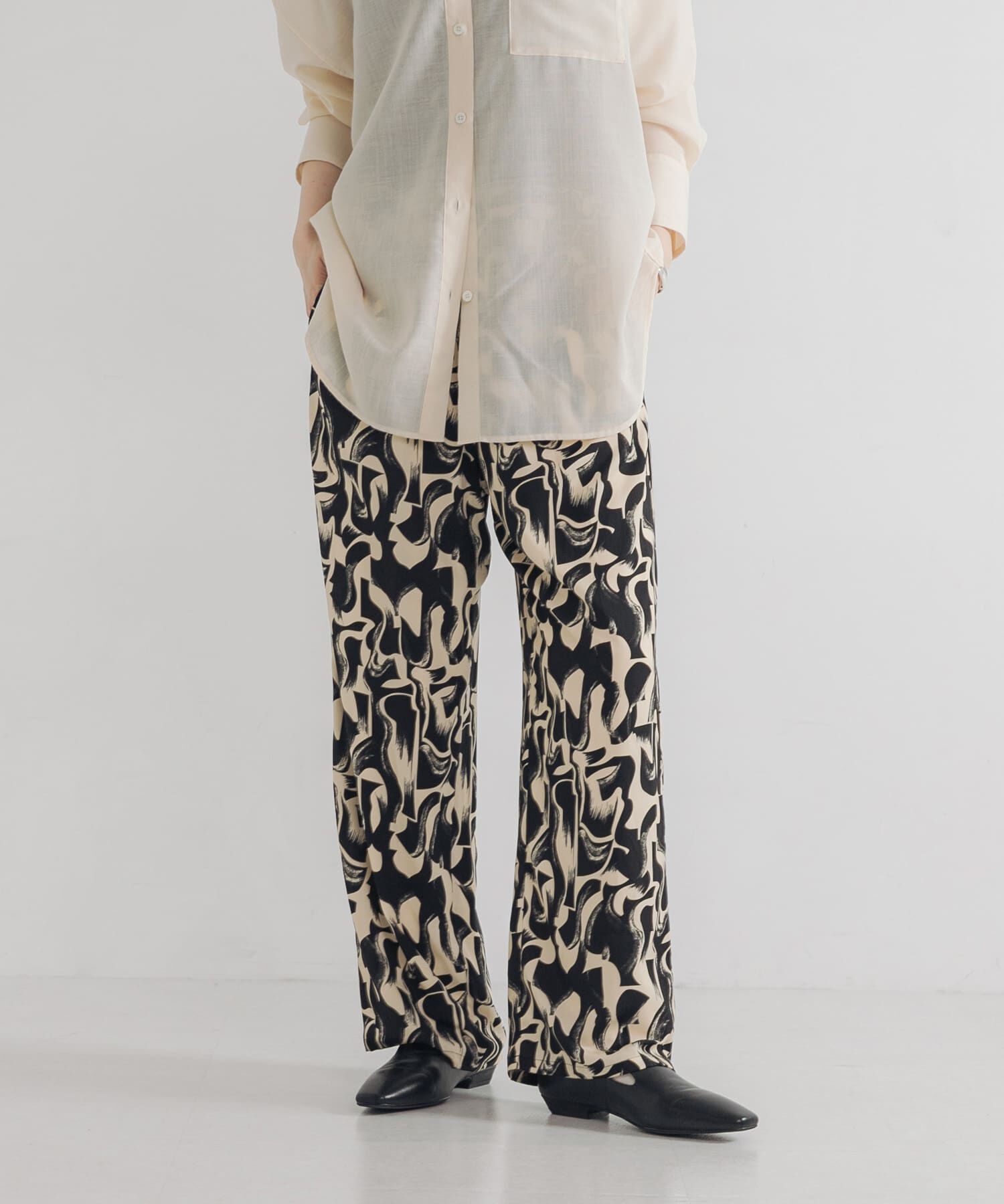 レトロな抽象柄が目を引くイージーパンツ。フランスのSPRINTEXの素材を使用しており、一点投入で華やかなスタイリングに導きます。さらりとした肌触りのデシン.. |