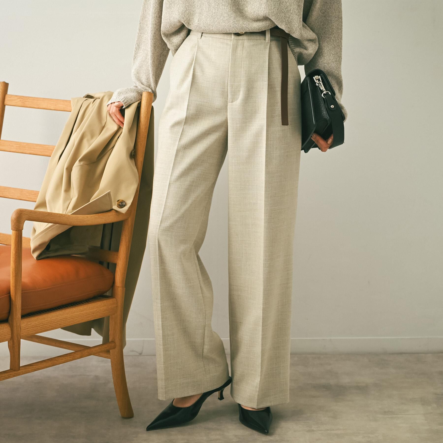 【デザイン】フロントに施された2タックデザインがさりげなく立体感をプラス。腰周りには余裕をもたせつつ、裾に向かって程よく広がるワイドシルエットが脚を.. |