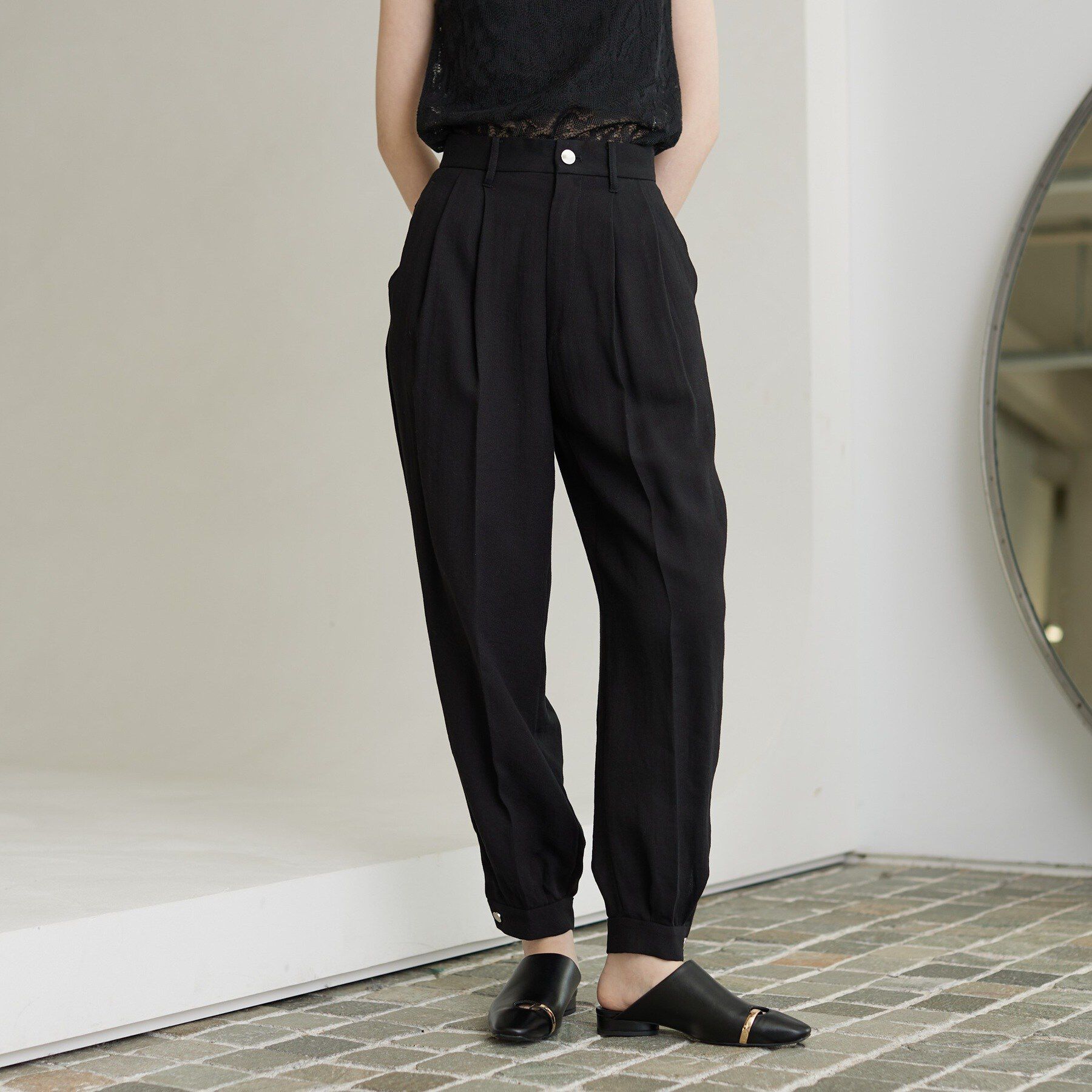 Design Pointハイウエストと深めのフロントタックで腰まわりにリラックス感を出したジョガーパンツ。テーパードシルエットと裾に入れたタックで洗練された印象.. |