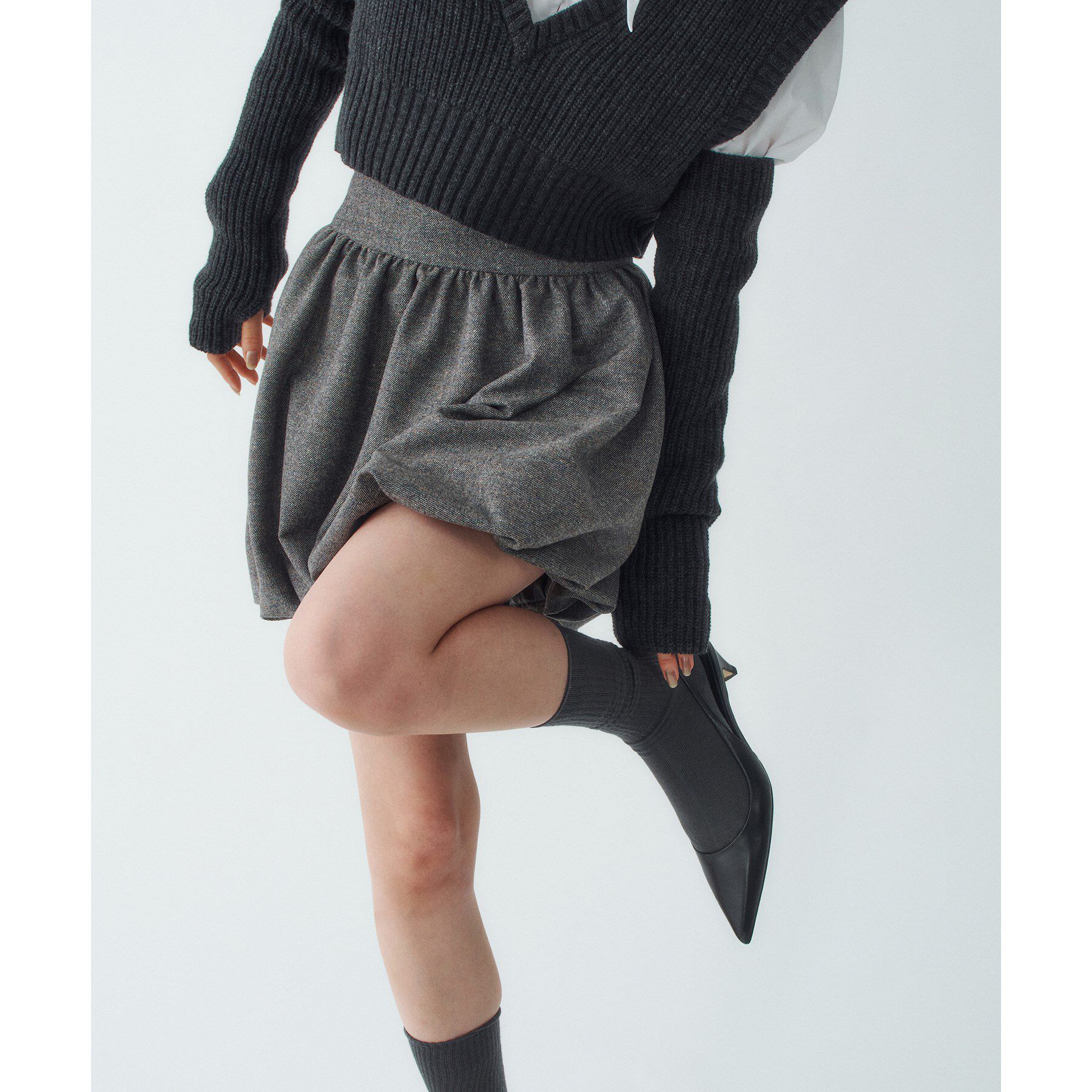 軽やかな印象、遊び心満載のバルーンミニスカート。【デザイン】カラフルな糸がさりげなく織り込まれたモノトーンツイードを使用。たっぷりのギャザーを施した.. |