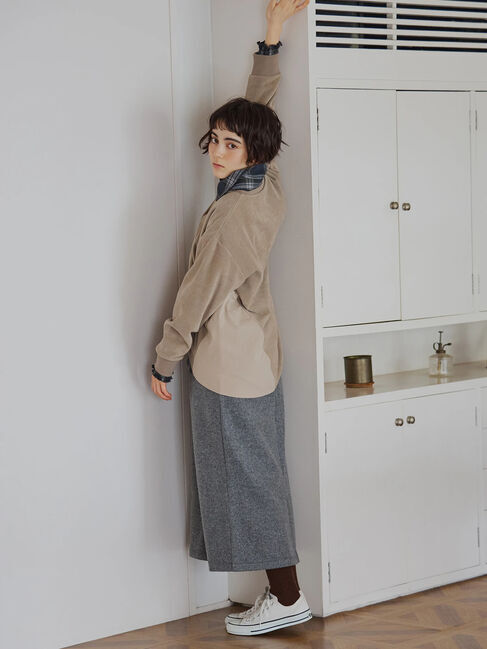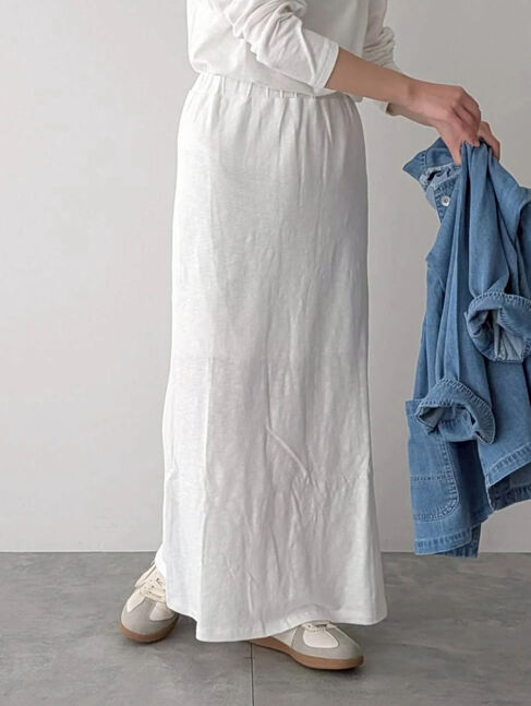 表情のあるスラブ素材を使用した、すっきりとしたナローシルエットのスカート。伸縮性のあるベア天竺素材で、穿き心地の良さも魅力です。ゆったりとしたトップ.. |