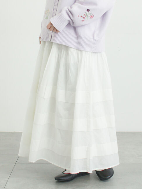 オーガンジーに愛らしい植物柄を刺しゅうであしらったスカート。ふんわりとしたシルエットに、ピンタックのラインがアクセントをプラス。フリル裾のインナース.. |