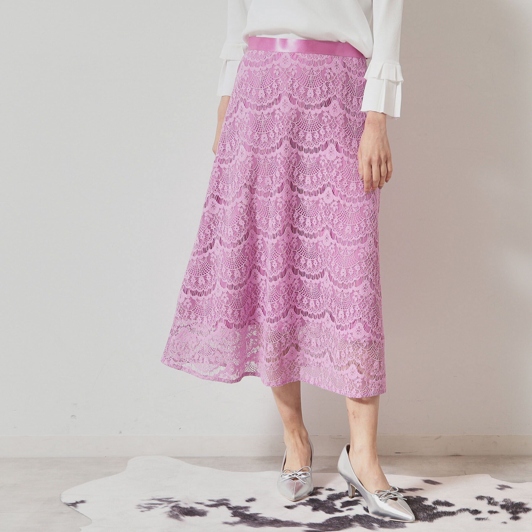 【デザイン】ウエストにサテンを使用したレースフレアスカート。裾のなびきが美しく上品な膝下丈なので、レディライクなスタイリングが完成します。裏付き。【.. |