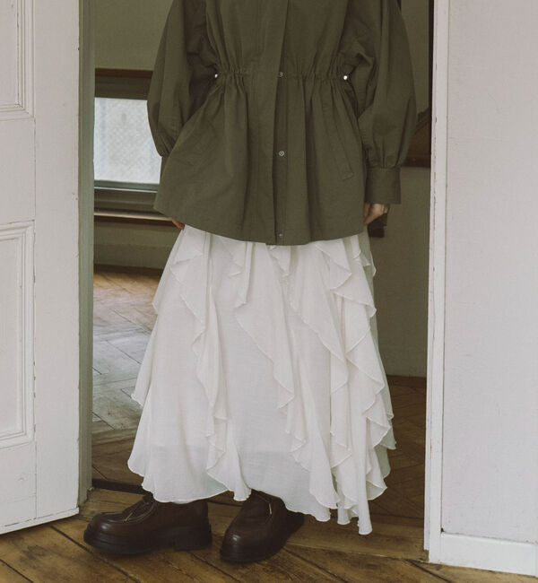 【allureville 2024 autumn&winter】アシンメトリーに揺れるラッフルが華やかなスカート。軽く、やや薄手でさらっとした肌触りが特徴で、ポリエステル.. |