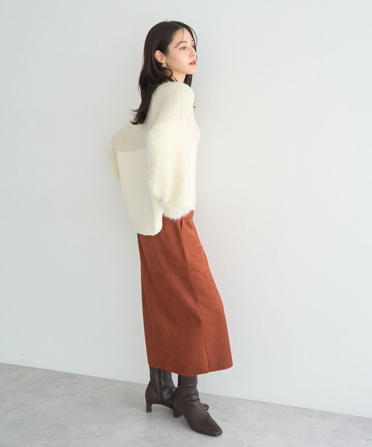 滑らかなフェイクスエードで仕立てたセミタイトスカート。程よいハイウエストでスタイルアップも叶えてくれるユースフルなデザインです。ストレッチ素材とウエ.. |