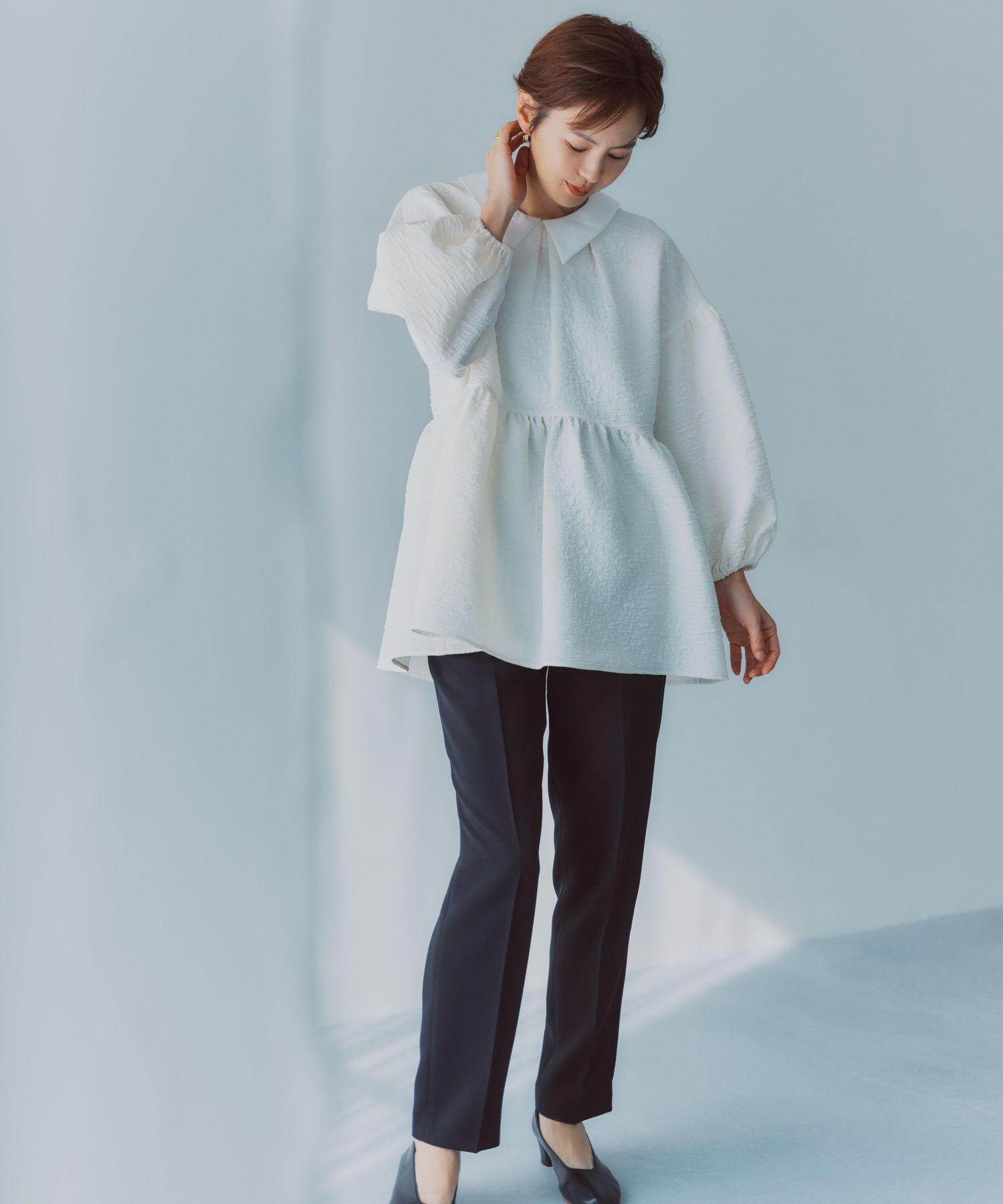 【デザインと特徴】 一枚でしっかり映える主役級ブラウス。 ランダムタックの入った袖がアクセントになり、 シンプルながらも顔回りを華やかに仕上げてくれま.. |