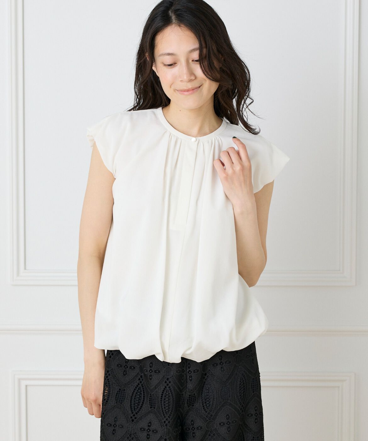 ■デザインストレッチ性を持つ快適素材を使用し、ニュアンスのある立体的なシルエットがポイントのフレンチスリーブトップス。 ウエストはギャザーが固定されて.. |