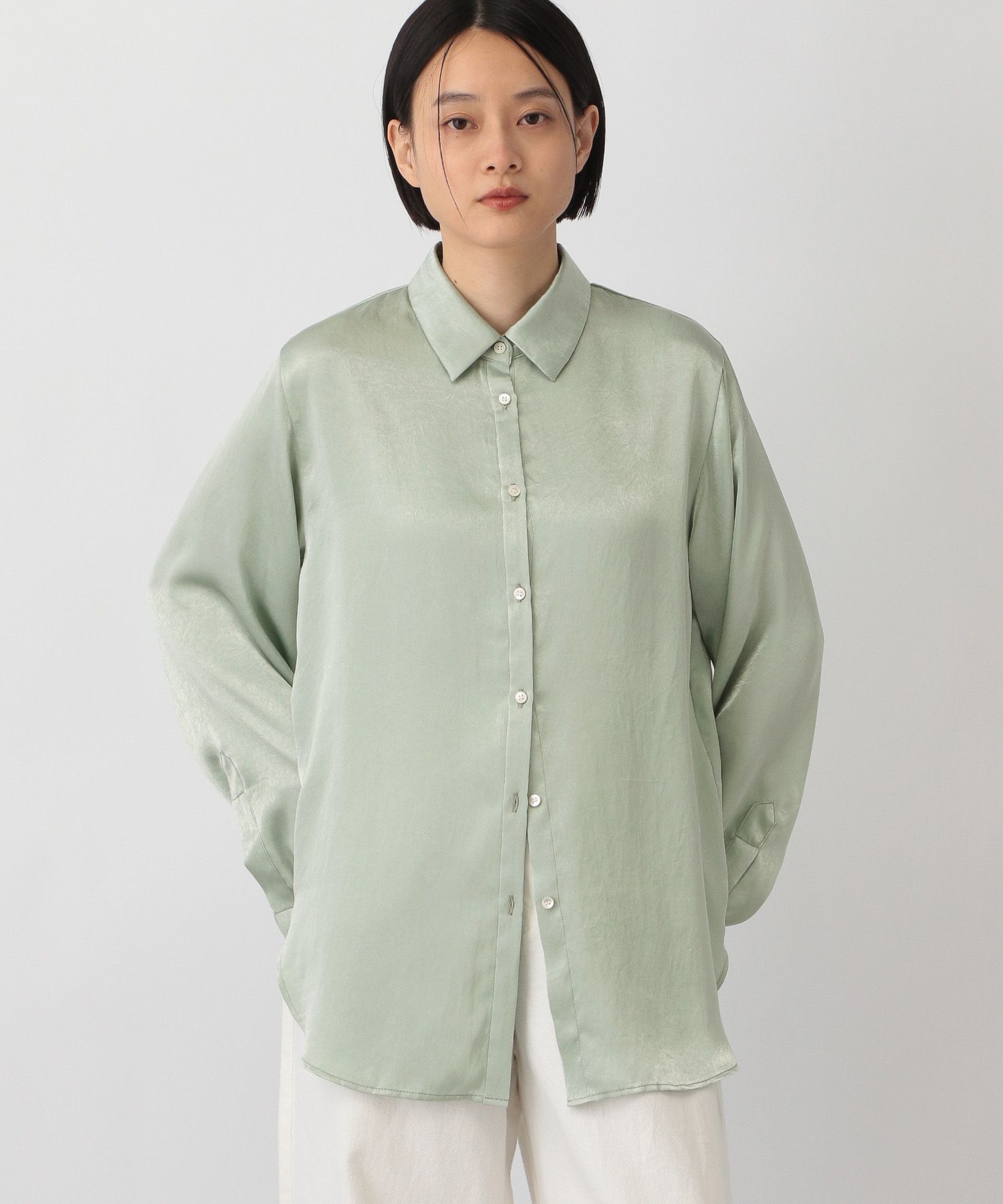 【デザインと特徴】 ニットの出番が増える時期に向けて、レイヤードスタイルを楽しめるように作ったサテンシャツ。 ツルっとした無駄のないシンプルなデザイン.. |