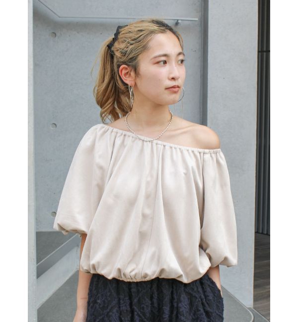 トレンド感のあるフェイクスウェード生地を使用したバルーンデザインがポイントのブラウス ■デザイン 首元はゴム仕様なので肩を落としてオフショルダーとして.. |