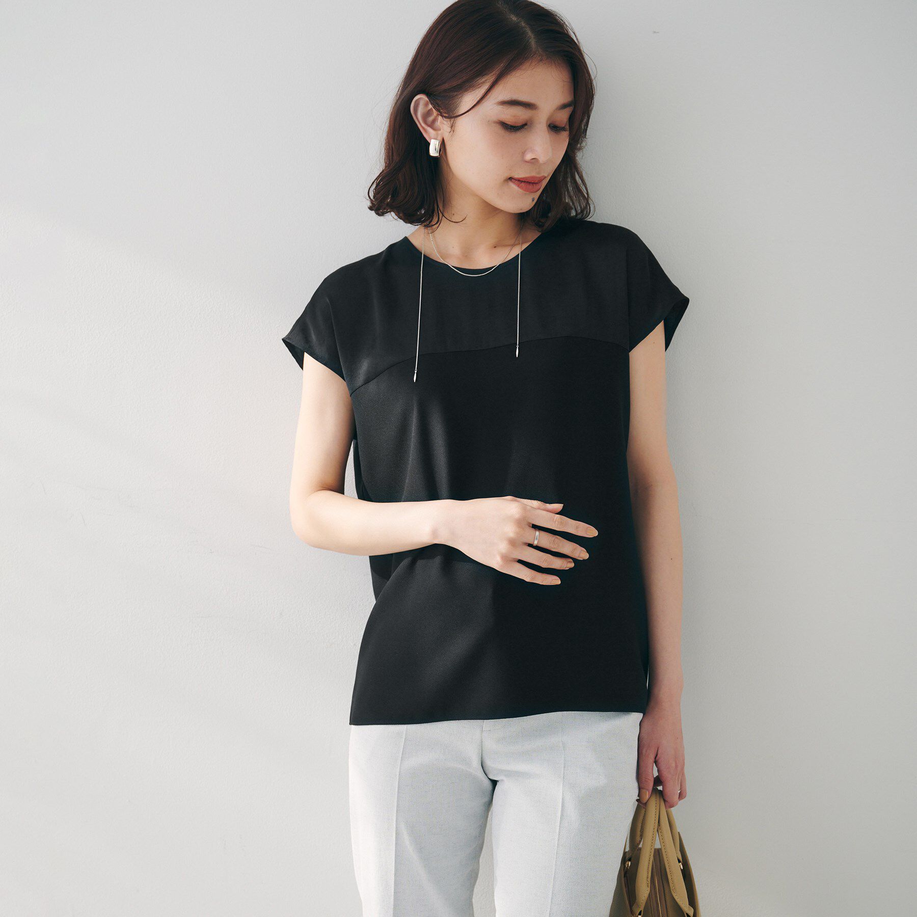 【デザイン】上品な光沢感のサテン素材と落ち感の美しい素材を合わせた異素材ドッキングブラウス。さりげない異素材使いで、主張しすぎずジャケットのインナー.. |