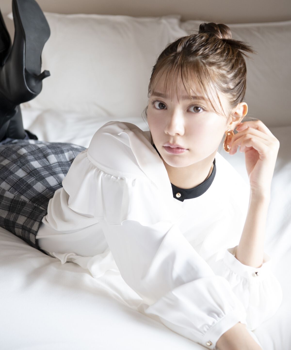 【透け感とチェック柄が魅力的なフリルブラウス】【Design/Styling】繊細なチェック柄が織りなすシアーな透け感が魅力のブラウス。襟元からバストにかけてあし.. |
