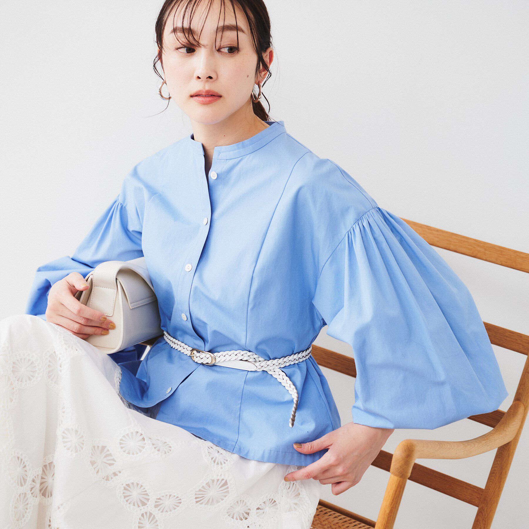 【デザイン】シェイプした身頃とボリュームスリーブのコントラストが効いたバンドカラーシャツ。ややドロップした肩の丸みとギャザーでボリュームを出した袖の.. |