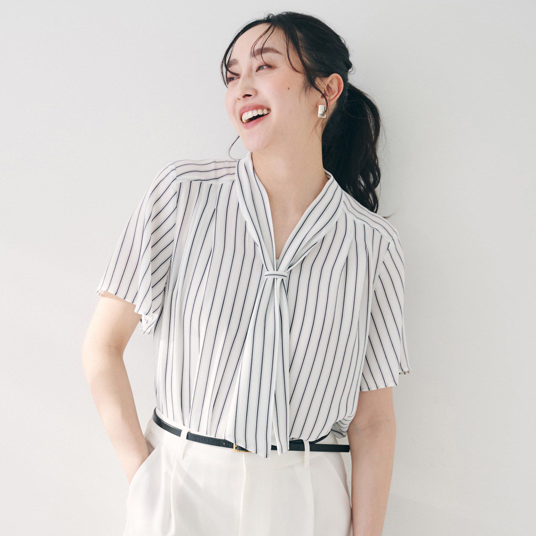 【デザイン】胸元のループにボウタイを通すとボウの形状が決まる便利なブラウスです。袖口は1枚着にも活用しやすい少しフレアのあるデザイン。ストライプ3色と.. |