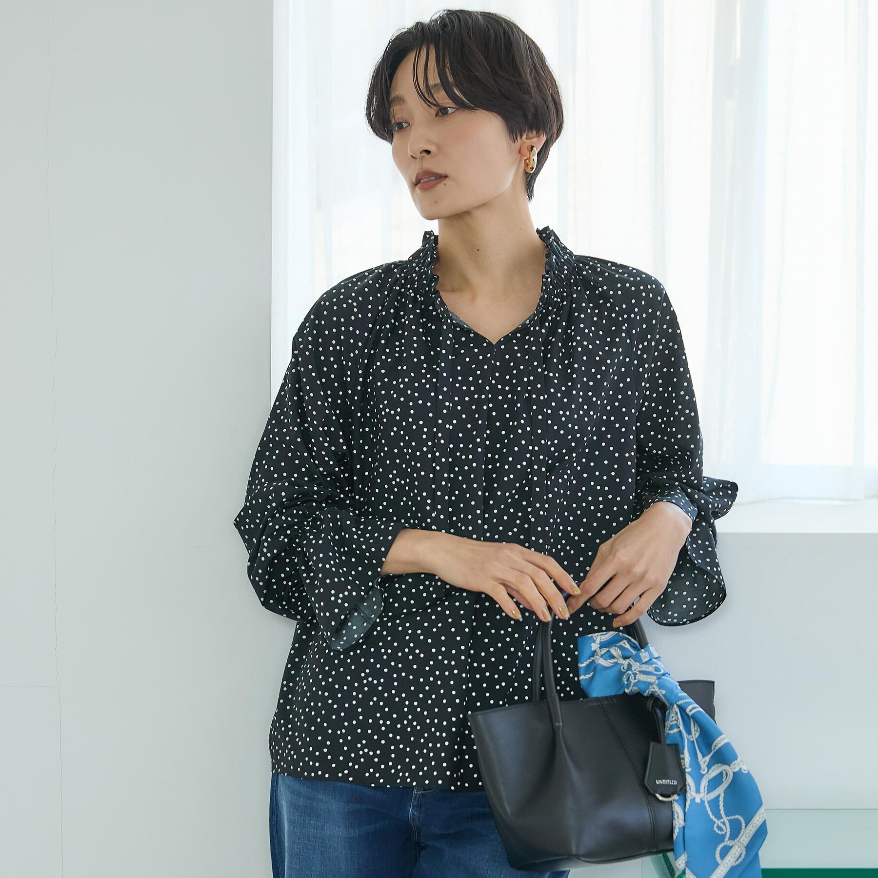 【デザイン】ランダムドット柄がモダンなブラウス。ドロスト仕様のフリル衿とキャンディスリーブの柔らかなシルエットが、上品さと女性らしさを際立たせます。.. |