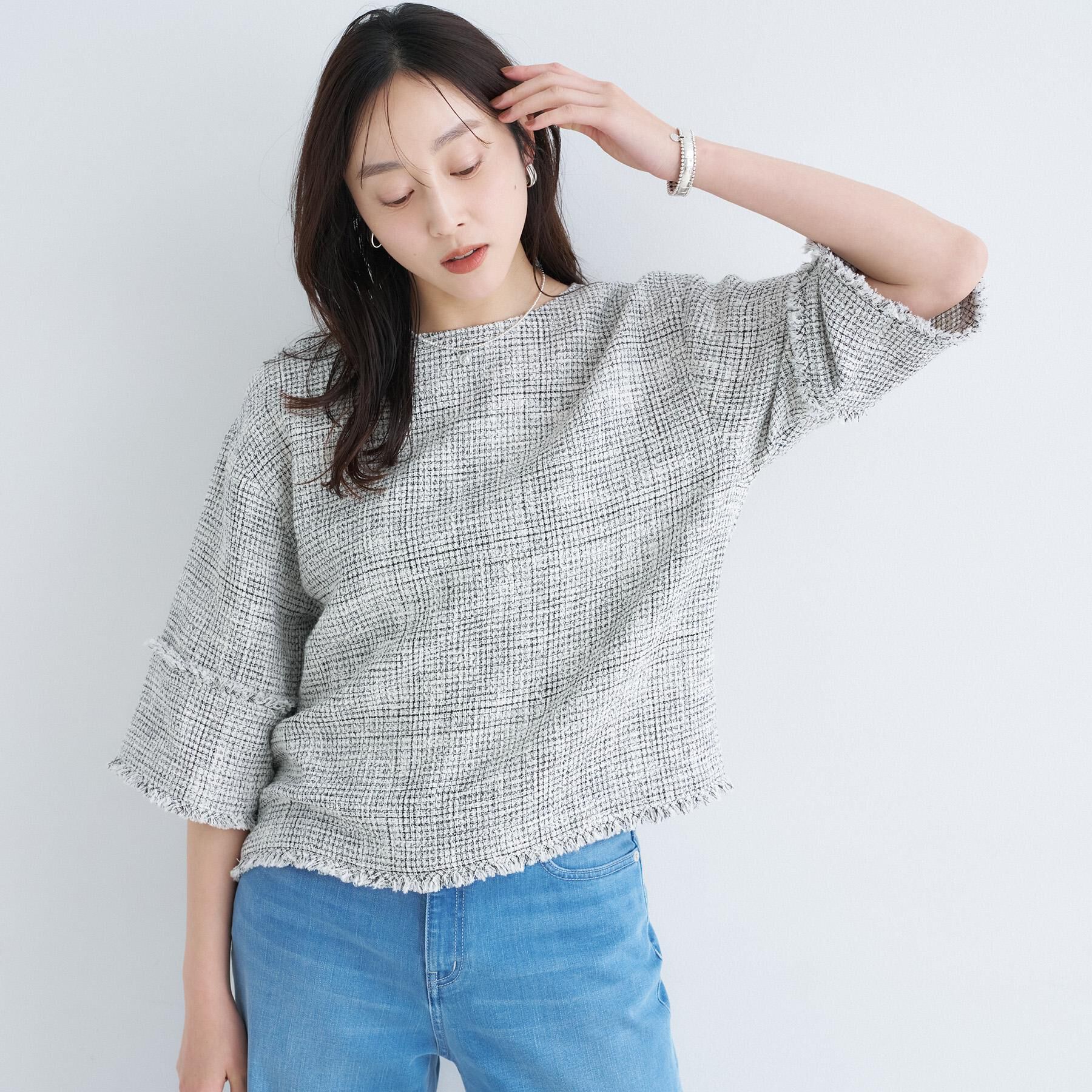 【デザイン】袖口と裾に施されたフリンジが、女性らしさを引き立てるツイード素材のブラウス。ドルマンスリーブのゆったりとしたシルエットは、体型をさりげな.. |