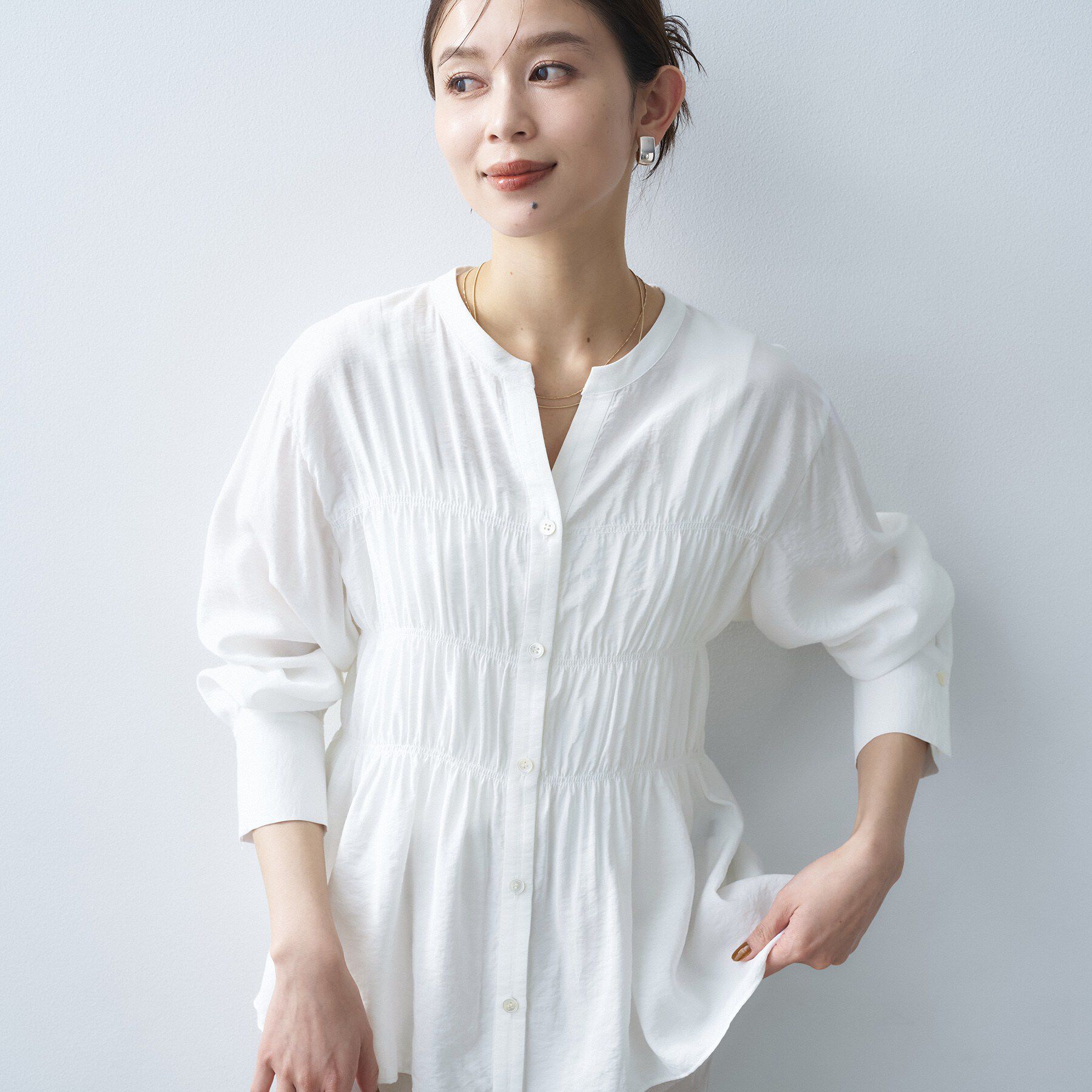 【デザイン】フロントに施されたシャーリングが特徴的なブラウスです。シャーリングによる立体的な表情が、柔らかな印象を与えつつ、スタイリングに洗練さをプ.. |