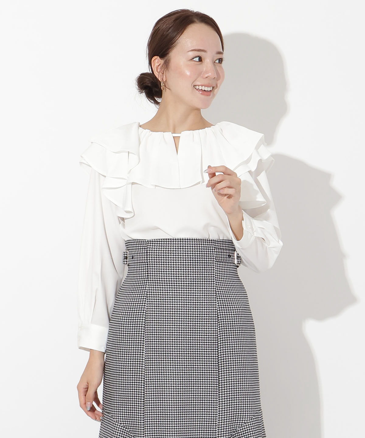 華やかさときちんと感を両立できる万能ブラウス【Design/Styling】・存在感のあるラッフルが目を引く、モードな表情のブラウス。・大きめのラッフルに配した細.. |