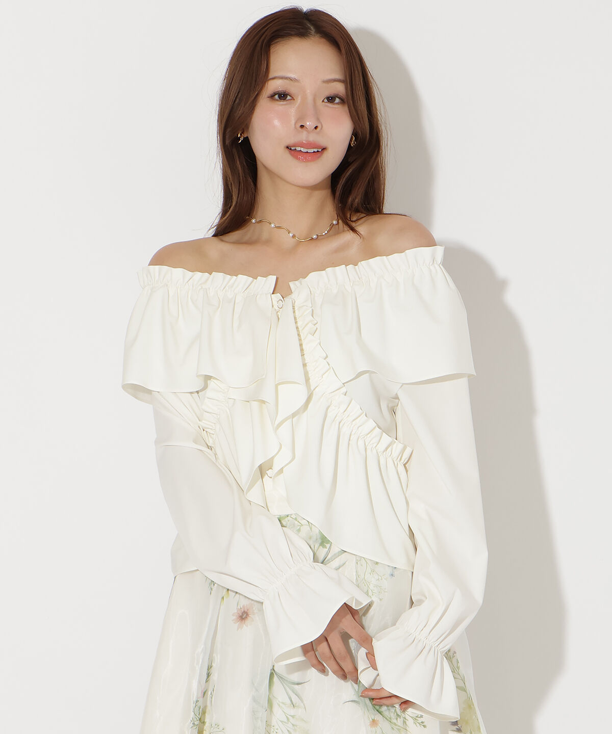 華やかさを纏う、チュール刺繍ブラウス【Design/Styling】・繊細なボタニカル柄刺繍が目を惹く、チュール素材のオフショルブラウスは、コーディネートの主役に.. |