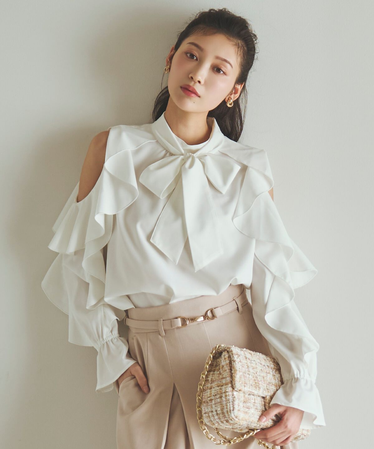 視線を惹きつける、フリルボウタイブラウス【Design/Styling】・ネックラインにあしらったボウタイと、肩から袖にかけて流れるように施されたフリルが、女性ら.. |